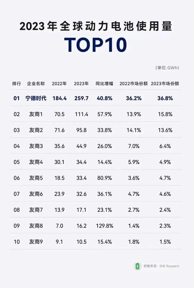 事實(shí)上,寧德時(shí)代評(píng)級(jí)之所以能夠獲得上調(diào),與其市場(chǎng)份額的持續(xù)提升不無關(guān)系?!?023年全球動(dòng)力電池使用數(shù)據(jù)》顯示,2023年寧德時(shí)代動(dòng)力電池使用量達(dá)259.7GWh,相較2022年增長(zhǎng)40.8%,市場(chǎng)占有率高達(dá)36.8%,穩(wěn)居世界第一,比第二名高出近21個(gè)百分點(diǎn)。