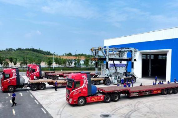 6月14日,位于湖北省宜昌市夷陵區(qū)龍泉鎮(zhèn)的宜昌楚能新能源創(chuàng)新科技有限公司集裝箱車間門口,6輛大貨車一字排開,裝載著6個楚能20尺5MWh電池集裝箱整裝待發(fā),即將啟航新疆。