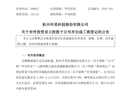 7月11日,杭州申昊科技股份有限公司發(fā)布關(guān)于對外投資設(shè)立控股子公司并完成工商登記的公告。公告顯示,為把握儲能行業(yè)發(fā)展機遇,杭州申昊科技股份有限公司(以下簡稱“申昊科技”)與淮南質(zhì)達鈉電智能制造有限公司(以下簡稱“淮南質(zhì)達”)共同出資設(shè)立杭州申昊儲能科技有限責任公司(以下簡稱“申昊儲能”),從事包括戶儲、工商業(yè)儲能、電網(wǎng)側(cè)儲能等業(yè)務(wù),擬研發(fā)虛擬電網(wǎng)技術(shù)和應(yīng)用,進一步提升儲能資源的聚合和管控,實現(xiàn)數(shù)字能源新業(yè)態(tài),培育公司新的業(yè)務(wù)增長點。