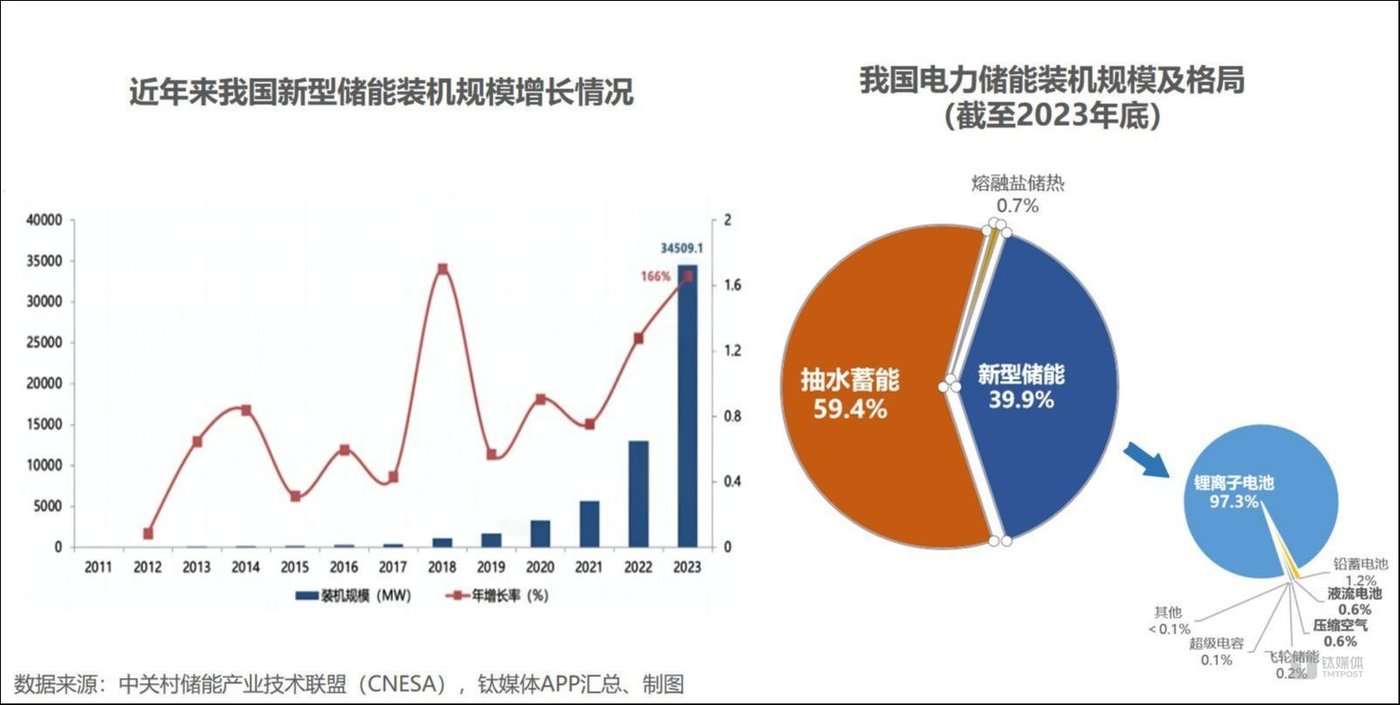 根據(jù)中關(guān)村儲能產(chǎn)業(yè)技術(shù)聯(lián)盟(CNESA)的統(tǒng)計,我國新型儲能市場累計裝機規(guī)模在2022年就實現(xiàn)了128%的同比增長,2023年更是大增166%。截至2023年底,電力儲能裝機規(guī)模中已有40%的新型儲能,在2021年還占據(jù)著超過85%市場的傳統(tǒng)抽水蓄能,份額則降至60%以下。而在新型儲能領(lǐng)域,鋰電是絕對主流,截至2023年底,該技術(shù)方向在新型儲能裝機中占比97.3%。