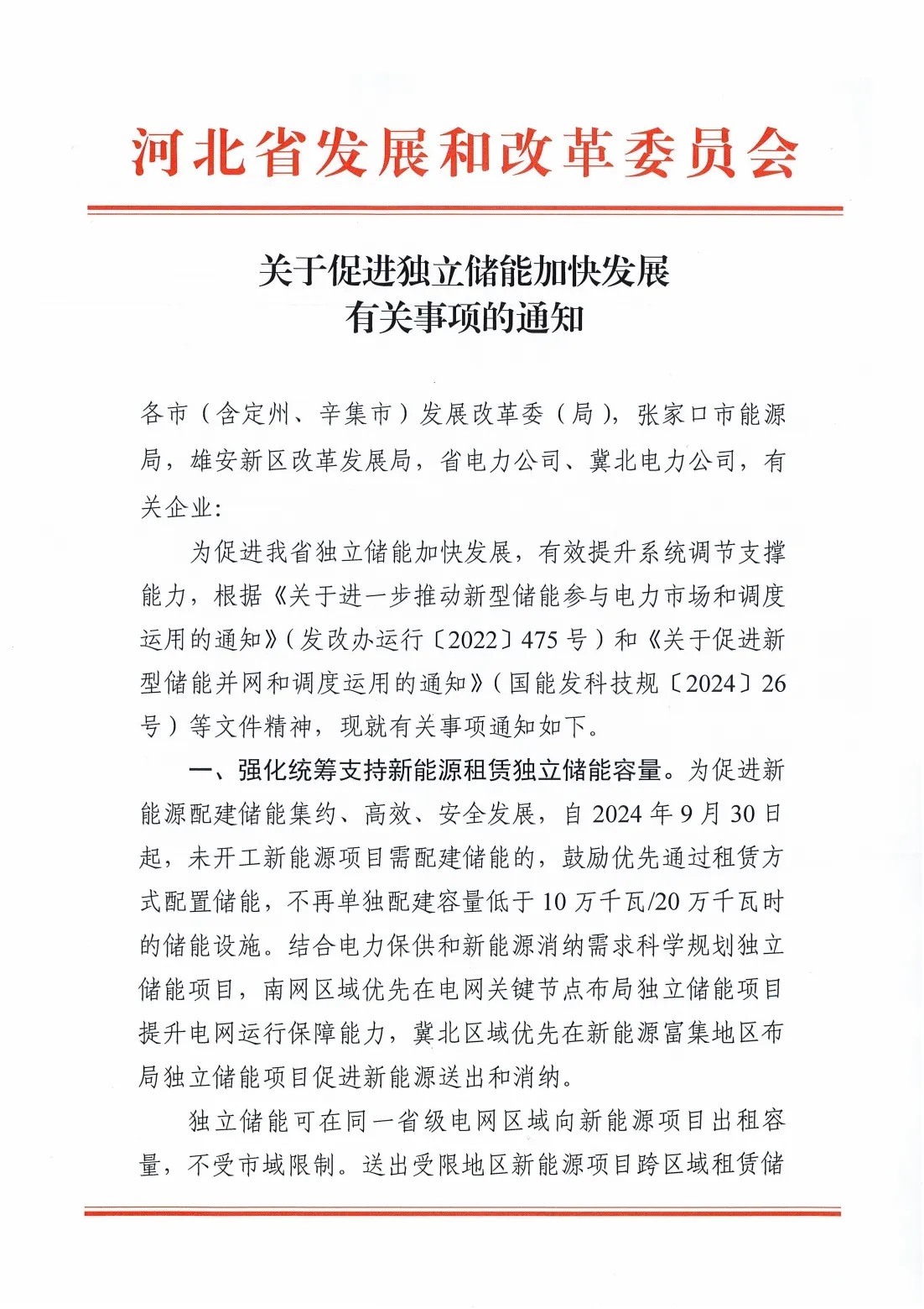 為促進(jìn)新能源配建儲能集約、高效、安全發(fā)展,自2024年9月30日起,未開工新能源項(xiàng)目需配建儲能的,鼓勵(lì)優(yōu)先通過租賃方式配置儲能,不再單獨(dú)配建容量低于10萬千瓦/20萬千瓦時(shí)的儲能設(shè)施。