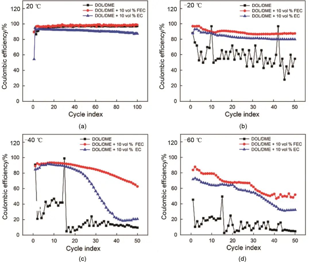 圖6 添加劑對(duì)鋰離子電池低溫循環(huán)性能的影響:使用含有不同添加劑的醚類電解液的Li/LFP電池在(a) 20 ℃、(b) -20 ℃、(c) -40 ℃和(d) -60 ℃下的循環(huán)性能