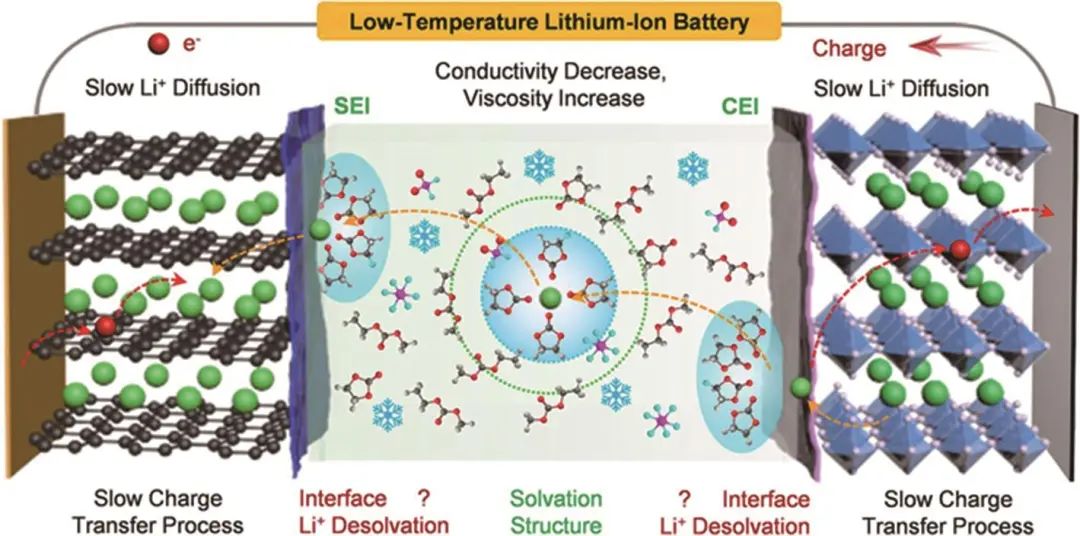 鋰電池低溫性能衰退的原因機(jī)理如圖2所示,主要是:①低溫下電解液的電導(dǎo)率下降,黏度上升,阻礙了Li+在電解液內(nèi)的遷移;②Li+在負(fù)極(例如石墨、硅、鋰金屬)或正極(例如LiNixMnyCo1-x-yO2)中的擴(kuò)散系數(shù)在低溫下下降,導(dǎo)致從電極擴(kuò)散到電解液內(nèi)的Li+減少;③低溫下電荷轉(zhuǎn)移過程更加困難,電荷轉(zhuǎn)移電阻(Rct)顯著提高,并且Li+在SEI和CEI內(nèi)的擴(kuò)散系數(shù)下降。這三個(gè)原因分別從主體電解液中遷移、電極內(nèi)部擴(kuò)散以及界面電荷轉(zhuǎn)移三個(gè)方面阻礙了鋰電池的正常運(yùn)行,造成了電池極化效應(yīng)的增大,從而降低了電池的放電容量和循環(huán)性能。