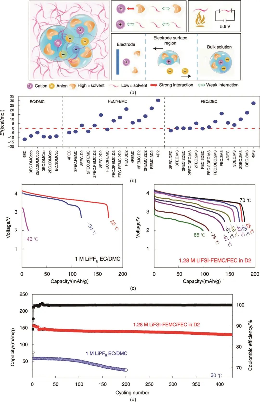 值得注意的是,對(duì)于傳統(tǒng)的碳酸酯基電解液,EC在溶劑中的占比被認(rèn)為是決定LIBs低溫性能的關(guān)鍵。EC由于具有高介電常數(shù),在溶劑化結(jié)構(gòu)研究中會(huì)優(yōu)先和Li+緊密結(jié)合,使得在去溶劑化時(shí)會(huì)提供較大的能壘阻礙,因此高EC含量不利于鋰電池的低溫性能。但是由于EC和石墨負(fù)極的特殊相容性,EC在目前的鋰離子電池電解液中仍然是必不可少的,無EC的電解液往往無法保證在石墨負(fù)極上形成穩(wěn)定的SEI膜,導(dǎo)致溶劑共嵌、電解液分解、石墨剝離等不利現(xiàn)象發(fā)生。因此設(shè)計(jì)一款低EC含量的電解液是LIBs低溫電解液設(shè)計(jì)的未來發(fā)展方向。