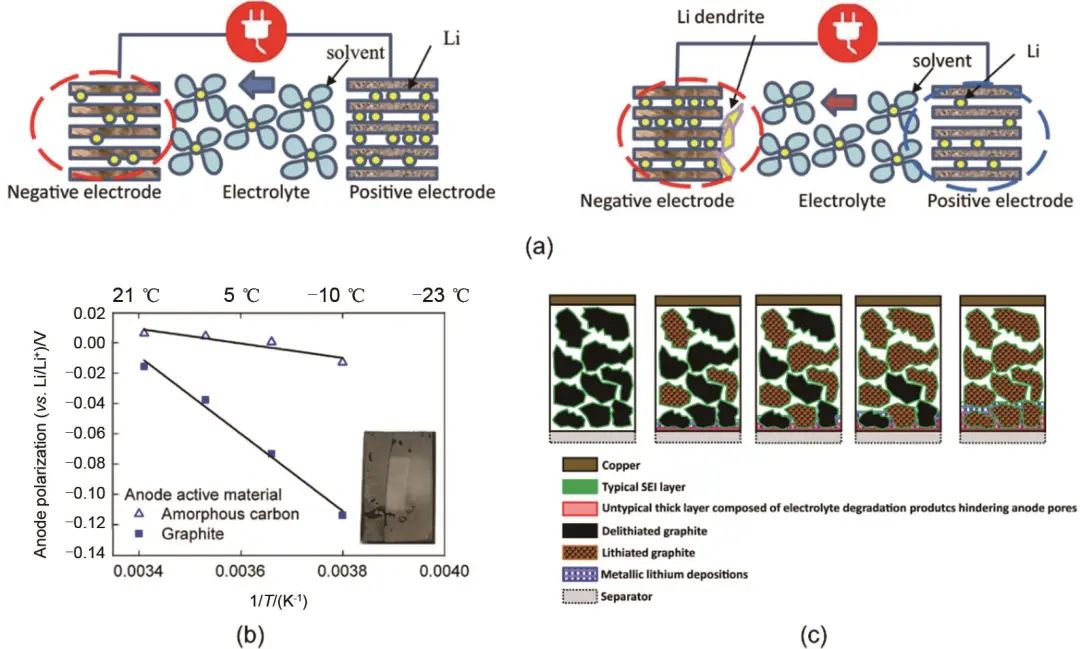 圖3 低溫對(duì)石墨負(fù)極的影響:(a) 低溫下石墨負(fù)極表面發(fā)生鋰沉積的示意圖;