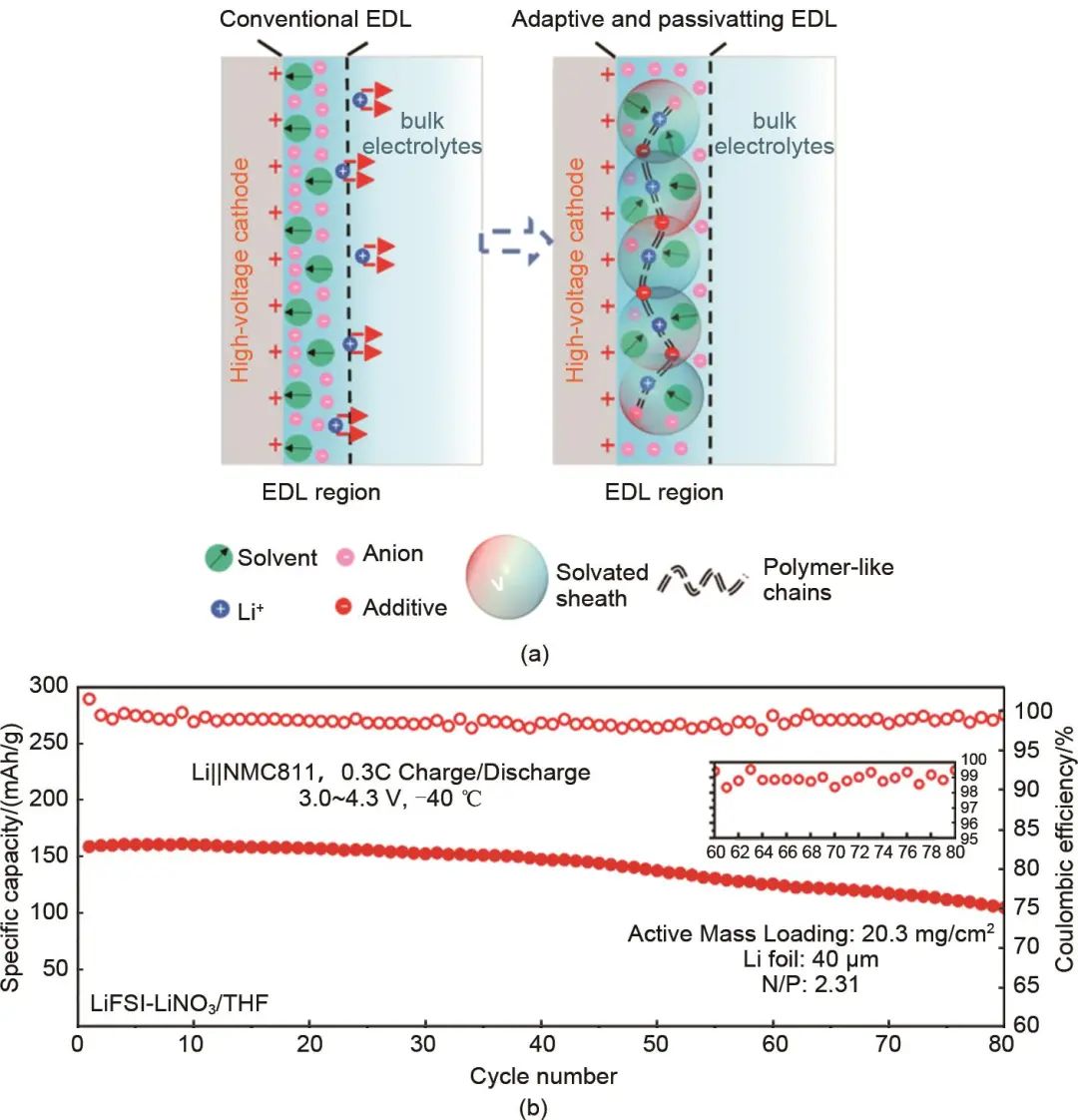 電池中的電極反應(yīng)都是在電極-電解質(zhì)界面發(fā)生的,調(diào)控鋰離子在電極-電解質(zhì)界面處的溶劑化結(jié)構(gòu)和電荷轉(zhuǎn)移行為,加快鋰離子在界面處的離子傳輸和去溶劑化過程,有助于電池實(shí)現(xiàn)在低溫下高效穩(wěn)定運(yùn)行。Zhang等提出了一種加入“刺激響應(yīng)型”添加劑的在正極/電解液界面構(gòu)建了動(dòng)態(tài)高穩(wěn)定雙電層的界面溶劑化結(jié)構(gòu)調(diào)控策略。作者篩選了一系列離子尺寸小且與鋰離子具有強(qiáng)結(jié)合能力的陰離子作為“刺激響應(yīng)型”添加劑(例如NO3-、ClO4-、Br-等),如圖11(a)所示,添加劑陰離子在電池充電時(shí),可在電壓驅(qū)動(dòng)下快速遷移到正極界面,添加劑陰離子與鋰離子間的強(qiáng)相互作用使得在正極界面雙電層中形成了特殊的“超分子動(dòng)態(tài)網(wǎng)絡(luò)結(jié)構(gòu)”。在此動(dòng)態(tài)網(wǎng)絡(luò)結(jié)構(gòu)中,添加劑吸引豐富的鋰離子,促進(jìn)鋰離子在界面處的遷移和從主體電解液中脫去溶劑,并且雙電層處于“富鋰離子-貧電解液”狀態(tài),其內(nèi)部所有的溶劑分子都參與鋰離子溶劑化,降低了雙電層內(nèi)溶劑的HOMO能級(jí),將不穩(wěn)定的“自由溶劑”排除出雙電層,顯著提升了正極界面上溶劑的氧化穩(wěn)定性。通過這樣巧妙的電極/電解液界面設(shè)計(jì)實(shí)現(xiàn)了本體醚基電解液和界面電解液的解耦,憑借本體電解液的高離子導(dǎo)電性和界面處快速的電荷轉(zhuǎn)移機(jī)制實(shí)現(xiàn)了優(yōu)異的低溫性能。相較于常規(guī)電解液在0 ℃以下迅速下降的低溫性能,添加劑輔助的醚類電解液實(shí)現(xiàn)了Li/NMC全電池在-40 ℃下的穩(wěn)定充放電循環(huán)[圖11(b)]。這種利用特殊界面化學(xué)來優(yōu)化電解液低溫性能的方式在后期被廣泛關(guān)注,研究人員進(jìn)一步豐富了具有界面調(diào)控功能的添加劑類型并對(duì)吸附性添加劑在界面的作用機(jī)理進(jìn)行了補(bǔ)充探究。