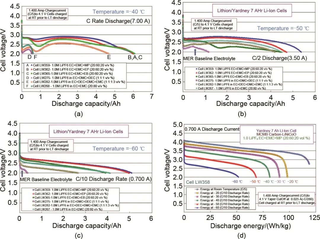 圖5 使用羧酸酯電解液的鋰離子電池低溫放電性能:使用不同羧酸酯電解液的鋰離子電池在 (a) -40 ℃、(b) -50 ℃和 (c) -60 ℃下的放電性能;