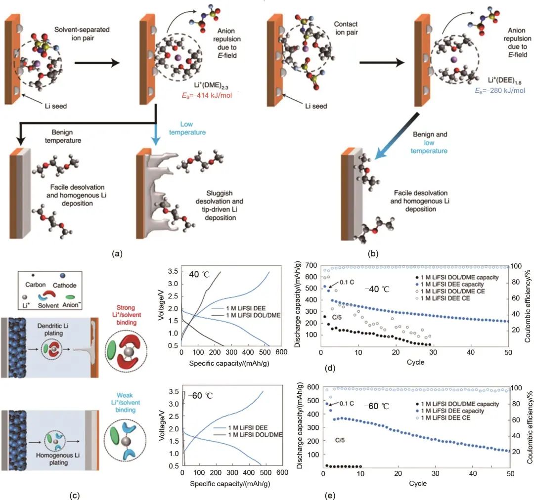 鋰離子在電解液中會(huì)發(fā)生溶劑化,鋰離子和溶劑的電子云富集區(qū)域的強(qiáng)相互作用使得電解液中通常會(huì)形成鋰離子與溶劑分子以配位形式結(jié)合的溶劑化鞘,在EC、DME這類對(duì)鋰鹽溶質(zhì)溶解能力強(qiáng)、與鋰離子有強(qiáng)相互作用的溶劑中,鋰鹽的陰陽離子會(huì)被這類強(qiáng)溶劑化溶劑完全電解,由于溶劑分子和鋰離子的結(jié)合能力更強(qiáng),在常規(guī)濃度的電解液中,溶劑分子占據(jù)溶劑化鞘的主導(dǎo),而陰離子通常不會(huì)與鋰離子結(jié)合,很少出現(xiàn)在溶劑化鞘內(nèi),這對(duì)應(yīng)著鋰鹽陰陽離子的完全解離。在電池充放電發(fā)生電極反應(yīng)的過程中,溶劑化的鋰離子首先需要發(fā)生去溶劑化,去溶劑化后的“裸露”的鋰離子穿過電極界面鈍化層后發(fā)生得失電子的電極反應(yīng),因此去溶劑化過程是正常電極反應(yīng)過程中必不可少的一部分[15]。由于溶劑分子對(duì)鋰離子的溶劑化是一個(gè)自發(fā)過程,去溶劑化這樣一個(gè)溶劑化的逆過程就表現(xiàn)為一個(gè)典型的耗能過程,去溶劑化過程的反應(yīng)能壘被認(rèn)為是影響電荷轉(zhuǎn)移過程和電極反應(yīng)動(dòng)力學(xué)的關(guān)鍵。具體分析鋰離子的去溶劑化過程,在溶劑化鞘接近電極時(shí),陰離子會(huì)因?yàn)殡姌O上電場(chǎng)的靜電作用很容易發(fā)生離去,因此鋰離子的去溶劑化能壘主要是由鋰離子和溶劑分子的結(jié)合能力決定的,強(qiáng)結(jié)合能力的溶劑分子占據(jù)鋰離子的全部配位位點(diǎn),脫去這些強(qiáng)溶劑化能力的溶劑需要克服很強(qiáng)的能量屏障,因此會(huì)嚴(yán)重影響鋰離子的電荷傳輸過程,產(chǎn)生很大的電荷轉(zhuǎn)移電阻Rct,尤其是在低溫下,過高的Rct會(huì)導(dǎo)致極化顯著增加,無法有效低溫運(yùn)行。相比之下,與鋰離子結(jié)合能力較弱的溶劑分子在去溶劑化時(shí)需要克服的能量屏障更小,并且由于溶劑分子的結(jié)合能力弱,陰離子可能會(huì)進(jìn)入溶劑化鞘,從而降低溶劑分子的配位數(shù),形成含有陰離子的溶劑化結(jié)構(gòu),這一結(jié)構(gòu)中溶劑分子的配位數(shù)小,并且溶劑分子本身的結(jié)合能力弱,使得其擁有明顯更優(yōu)的去溶劑化性能,從而降低了鋰離子的電荷轉(zhuǎn)移電阻,降低了極化效應(yīng),有利于鋰的均勻沉積和低溫下的穩(wěn)定循環(huán)。這一類由與鋰離子結(jié)合能力弱的溶劑分子構(gòu)成的電解液被稱為弱溶劑化能電解液,其通過對(duì)溶劑與鋰離子間相互作用的調(diào)控對(duì)電解液溶劑化結(jié)構(gòu)進(jìn)行針對(duì)性設(shè)計(jì),從而加速低溫下的去溶劑化過程,提升電池的低溫性能。