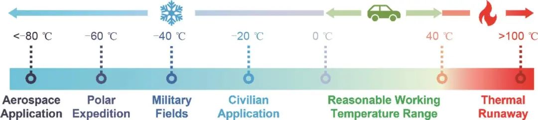 除了對(duì)能量密度的要求外,對(duì)鋰電池在特殊環(huán)境下的使用性能要求也越來越高。近年來,鋰電池在低溫環(huán)境下的性能受到了廣泛的關(guān)注。圖1展示了應(yīng)用于不同領(lǐng)域的鋰電池所需的有效工作溫度范圍,在寒冷的季節(jié)或嚴(yán)寒地區(qū),消費(fèi)電子或電動(dòng)汽車上的民用鋰電池需要適應(yīng)接近-20 ℃的低溫并要求進(jìn)行穩(wěn)定的電池充放電,而使用在軍事或航空航天領(lǐng)域的電化學(xué)儲(chǔ)能系統(tǒng)的使用環(huán)境溫度甚至低于-60 ℃,但是目前普遍商業(yè)化使用的碳酸酯基電解液在-20 ℃時(shí)會(huì)發(fā)生電導(dǎo)率下降、黏度上升,甚至凝固等現(xiàn)象,引發(fā)電池嚴(yán)重的容量衰退、壽命減短和充電困難,這限制了現(xiàn)有鋰離子電池在低溫條件下的使用。因此如何抑制鋰電池在低溫下的容量衰退,提高其在低溫下的使用壽命和循環(huán)穩(wěn)定性,是鋰電池未來發(fā)展中的一個(gè)最重要的挑戰(zhàn)。