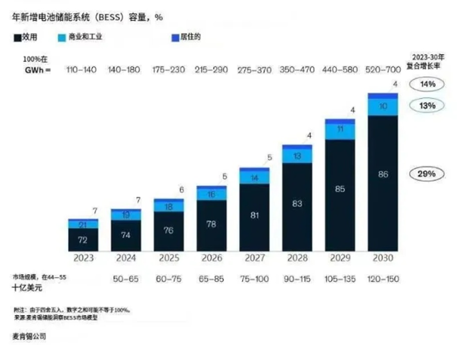 跨國(guó)知名咨詢公司麥肯錫預(yù)計(jì):公用事業(yè)規(guī)模的電化學(xué)儲(chǔ)能(已占新增年產(chǎn)能的大部分)將在未來(lái)六年中每年都保持增長(zhǎng)29% 左右,是三個(gè)細(xì)分市場(chǎng)中增長(zhǎng)最快的。2030年,電池儲(chǔ)能系統(tǒng)的市場(chǎng)容量可能會(huì)增加5倍。到2030 年,公用事業(yè)規(guī)模的年度裝機(jī)容量將達(dá)到 450 至 620 吉瓦時(shí)(gwh),公用事業(yè)規(guī)模的電化學(xué)儲(chǔ)能將占據(jù)當(dāng)年總市場(chǎng)的90%,全球電化學(xué)儲(chǔ)能全部市場(chǎng)需求將達(dá)到700gwh,1200億至1500 億美元,或1萬(wàn)億人民幣左右。