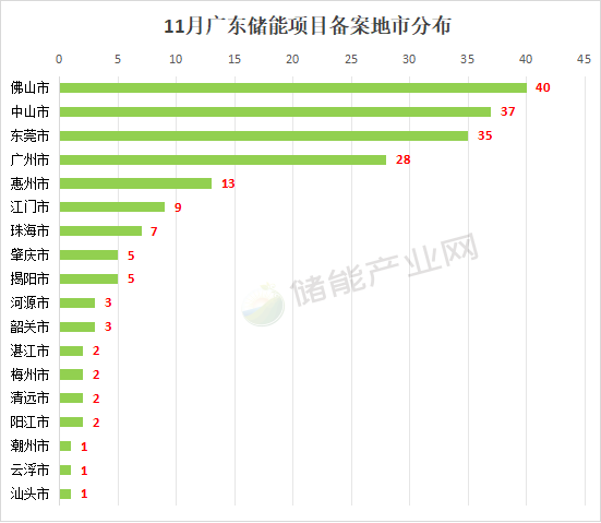 從各地市分布情況來看,儲(chǔ)能備案項(xiàng)目地市分布數(shù)量排名第一的佛山,為40個(gè);中山、東莞位列第二和第三,分別為37個(gè)和35個(gè)。前三名備案數(shù)量已經(jīng)占據(jù)廣東省57%以上。