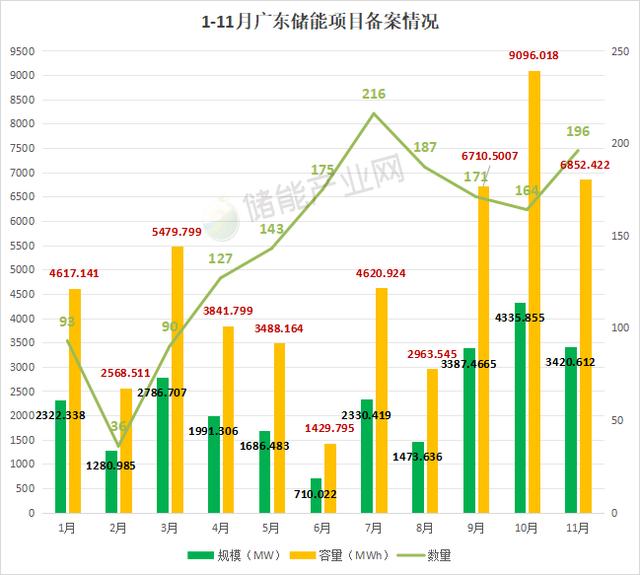 從1-11月廣東儲(chǔ)能項(xiàng)目備案情況來看,11月備案數(shù)量有196個(gè),相較于10月,數(shù)量上有所增加,但儲(chǔ)能項(xiàng)目備案規(guī)模出現(xiàn)下滑,合計(jì)為3420.612MW/6852.422MWh,規(guī)模下降的主要是因?yàn)榇笮蛢?chǔ)能電站項(xiàng)目的減少,大部分為用戶側(cè)工商業(yè)儲(chǔ)能項(xiàng)目。
