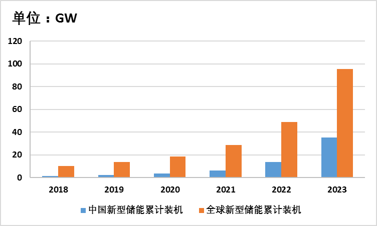 據(jù)統(tǒng)計,2018年以來,中國和全球新型儲能裝機規(guī)模都在不斷增加。2021年開始,增加幅度更為明顯,2023年中國新型儲能累計裝機高達35GW,全球新型儲能累計裝機高達95GW,具體如圖1-1所示。
