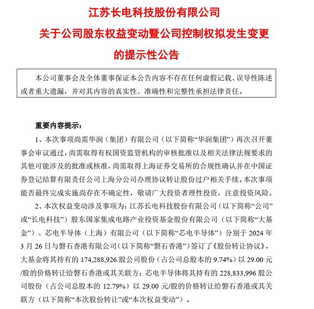 3月26日晚間,長電科技(SH600584,股價28.25元,市值505.3億元)發(fā)布公告稱,公司股東國家集成電路產(chǎn)業(yè)投資基金股份有限公司(以下簡稱“大基金”)、芯電半導(dǎo)體(上海)有限公司(以下簡稱“芯電半導(dǎo)體”)分別與磐石香港有限公司(以下簡稱“磐石香港”)簽訂《股份轉(zhuǎn)讓協(xié)議》,大基金及芯電半導(dǎo)體均以29元/股價格將合計所持22.53%公司股份轉(zhuǎn)讓給磐石香港或其關(guān)聯(lián)方;完成后公司控股股東將變更為磐石香港或其關(guān)聯(lián)方,實控人將變更為中國華潤,公司股票復(fù)牌。