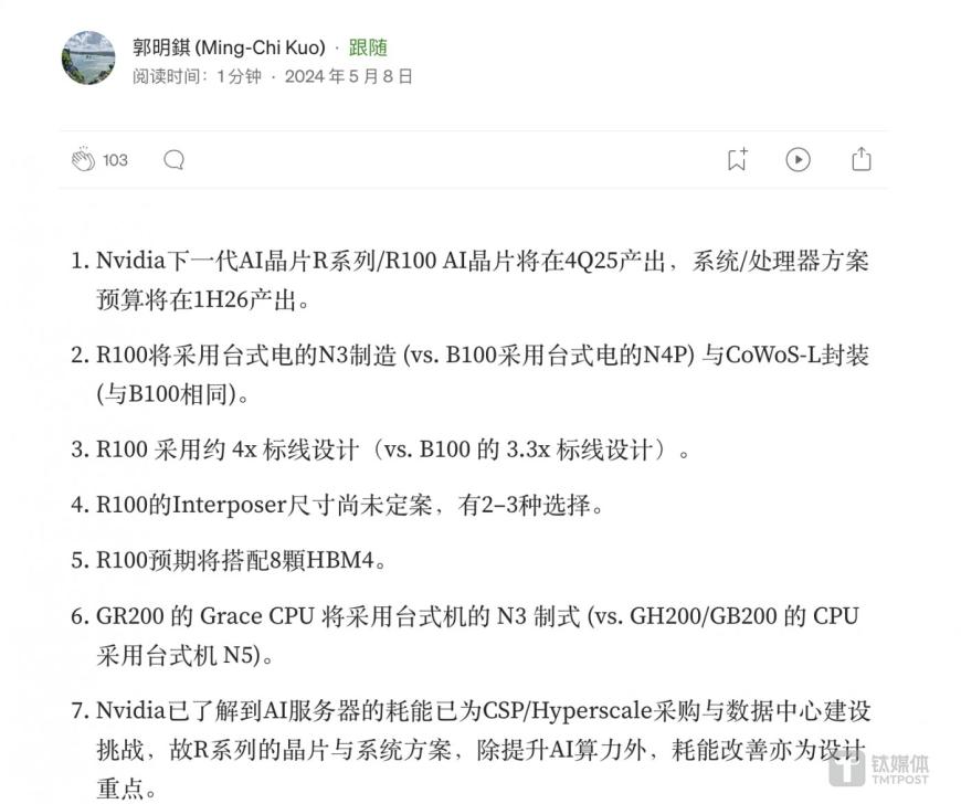 天風國際證券分析師郭明錤指出,英偉達下一代R系列/R100 AI芯片將于2025年第四季度量產(chǎn),采用臺積電3nm制程、4個reticle設計,搭配8顆HBM4,重點改善能耗。最早在明年,R100 AI GPU就將登場。