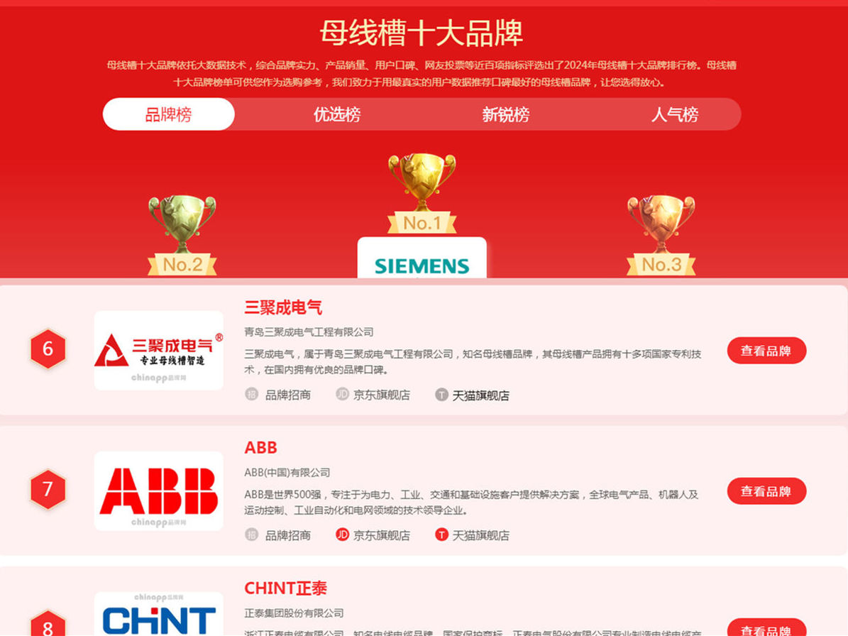 近日,2024年度母線槽十大品牌由發(fā)布,三聚成電氣、施耐德電氣、ABB、西門子等榮耀上榜。據(jù)了解,本次母線槽十大品牌排行榜,經(jīng)過統(tǒng)計(jì)有10家品牌成功入選中國母線槽十大品牌排行榜,經(jīng)過網(wǎng)民投票和專家的綜合評估,最終確定了母線槽十大品牌名單: