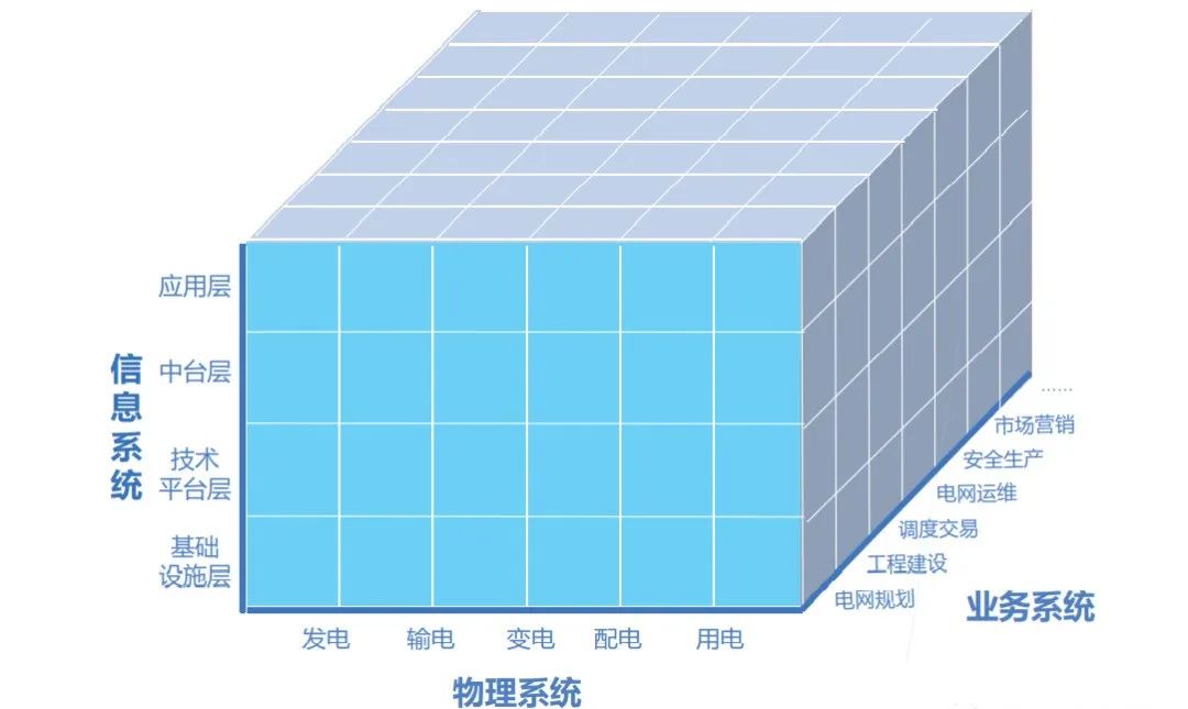 數(shù)字電網(wǎng)技術(shù)體系按照數(shù)字電網(wǎng)理論模型,由物理系統(tǒng)、信息系統(tǒng)、業(yè)務(wù)系統(tǒng)構(gòu)成。如下圖的三維立體結(jié)構(gòu)描述了數(shù)字電網(wǎng)技術(shù)體系架構(gòu),物理系統(tǒng)以發(fā)、輸、變、配、用為主線,業(yè)務(wù)系統(tǒng)分為電網(wǎng)規(guī)劃、工程建設(shè)、調(diào)度交易、電網(wǎng)運(yùn)維、安全生產(chǎn)、市場(chǎng)營(yíng)銷、人財(cái)物管理、黨政工團(tuán)等方面;信息系統(tǒng)包 括基礎(chǔ)設(shè)施層、技術(shù)平臺(tái)層、中臺(tái)層、應(yīng)用層。