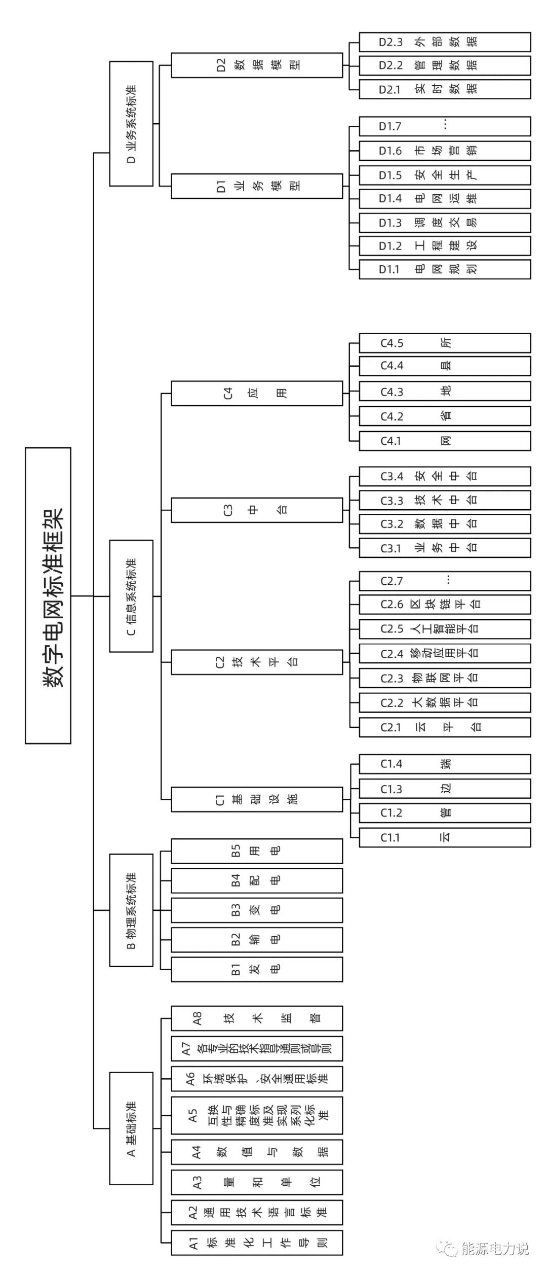 基礎(chǔ)標(biāo)準(zhǔn):包括了標(biāo)準(zhǔn)化工作導(dǎo)則、通用技術(shù)語(yǔ)言標(biāo)準(zhǔn)等基礎(chǔ)通用標(biāo)準(zhǔn)。物理系統(tǒng)標(biāo)準(zhǔn):包括了發(fā)電、輸電、變電、配電、用電五部分。信息系統(tǒng)標(biāo)準(zhǔn) :包括了業(yè)務(wù)中臺(tái)、數(shù)據(jù)中臺(tái)、技術(shù)中臺(tái)、安全中臺(tái)等中臺(tái)的標(biāo)準(zhǔn)。業(yè)務(wù)系統(tǒng)標(biāo)準(zhǔn):包括了業(yè)務(wù)模型與數(shù)據(jù)模型。