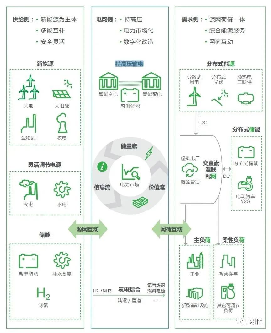 與傳統(tǒng)電力系統(tǒng)相比,它強(qiáng)調(diào)的是以“新能源”為主體,逐步提升光伏、風(fēng)電等新能源發(fā)電的比例,并通過電網(wǎng)系統(tǒng)運(yùn)行的變革,實現(xiàn)新能源高效開發(fā)利用和各類負(fù)荷的友好接入,提升終端電氣化率,通過發(fā)電、輸電、配電、用電等各環(huán)節(jié)的共同發(fā)力,最終實現(xiàn)電力行業(yè)減排降碳目標(biāo)。可以說,新型電力系統(tǒng)是我們邁向碳達(dá)峰碳中和的關(guān)鍵所在。