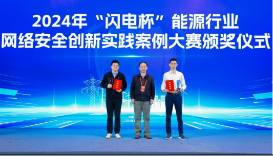 大會(huì)舉行“閃電杯”能源行業(yè)網(wǎng)絡(luò)安全創(chuàng)新實(shí)踐案例大賽頒獎(jiǎng)儀式,嘉賓為獲得一、二、三等獎(jiǎng)的單位代表頒發(fā)獎(jiǎng)杯獎(jiǎng)狀。