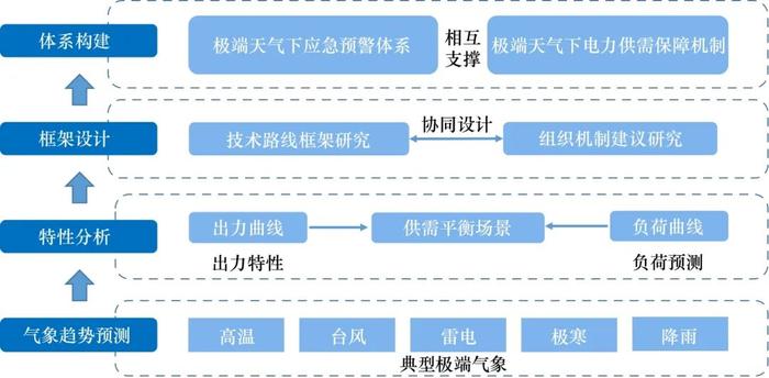 新能源出力具有波動性,高比例新能源接入的新型電力系統(tǒng),其功率和能量靈活平衡需求顯著提高;極端天氣頻發(fā)趨勢將進一步放大新能源發(fā)電隨機性及波動性對電力系統(tǒng)安全運行的不利影響。針對全球氣候變暖趨勢,研究我國大型新能源基地、負荷中心等送受端地區(qū)的極端氣象特征與演變趨勢,揭示典型極端氣象場景影響電力供給及負荷需求側的作用機理與傳導機制。結合高溫、臺風、雷電等極端天氣的歷史事件,新能源的出力特性、負荷特性,分析極端天氣頻發(fā)條件下的電力供需平衡場景與風險;從組織、管理、技術等維度,形成應對極端氣象的電力供需保障技術框架與應急組織機制(見圖4)。