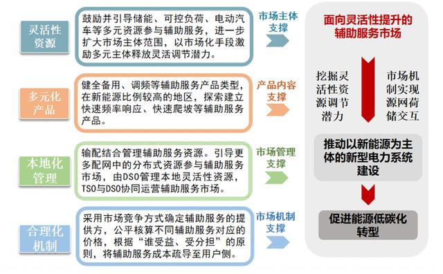 一方面要挖掘不同環(huán)節(jié)的靈活性資源參與系統(tǒng)調(diào)節(jié);另一方面要完善市場(chǎng)機(jī)制,給予資源一定的激勵(lì)與補(bǔ)償。電力市場(chǎng)輔助服務(wù)作為提升電力系統(tǒng)靈活性的手段之一,主要包括一次調(diào)頻、自動(dòng)發(fā)電控制、調(diào)峰、無(wú)功調(diào)節(jié)、備用、黑啟動(dòng)等。