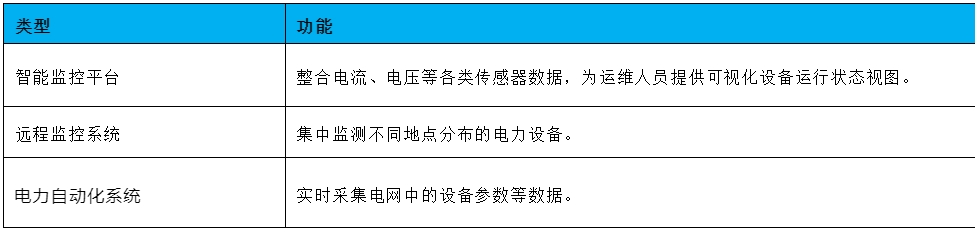 通過(guò)安裝在電力設(shè)備上的電流、電壓、濕度等各類傳感器,采集設(shè)備運(yùn)行參數(shù)。其功能見(jiàn)表3。