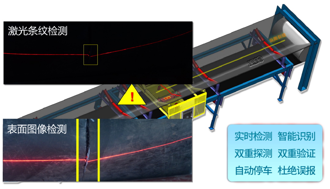 斗輪機操作人員識別驗證采用深度學(xué)習(xí)算法,支持離線比對,人臉比對時間<0.2s/人,人臉比對準確率≥99%;輸送帶縱向撕裂檢測裝置使用激光束掃描皮帶表面,相機采集圖像信息,獨立鑒定,相互驗證,當(dāng)兩種手段100%確認了縱向撕裂發(fā)生,系統(tǒng)才進行報警。