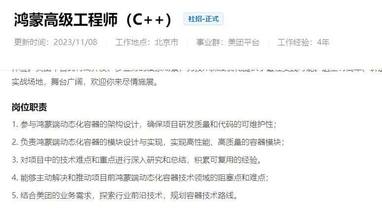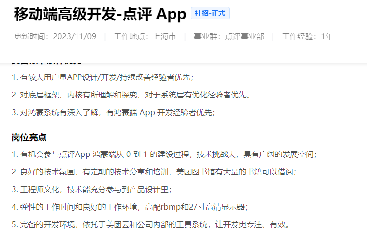 美團(tuán)發(fā)布了鴻蒙高級(jí)工程師、鴻蒙基建工程師等多個(gè)鴻蒙開(kāi)發(fā)相關(guān)崗位。主要開(kāi)發(fā)美團(tuán)鴻蒙App、大眾點(diǎn)評(píng)鴻蒙App。網(wǎng)易更新了高級(jí)/資深A(yù)ndroid 開(kāi)發(fā)工程師崗位,職位要求參與云音樂(lè)多端多OS的產(chǎn)品(Android、鴻蒙等)研發(fā)迭代。