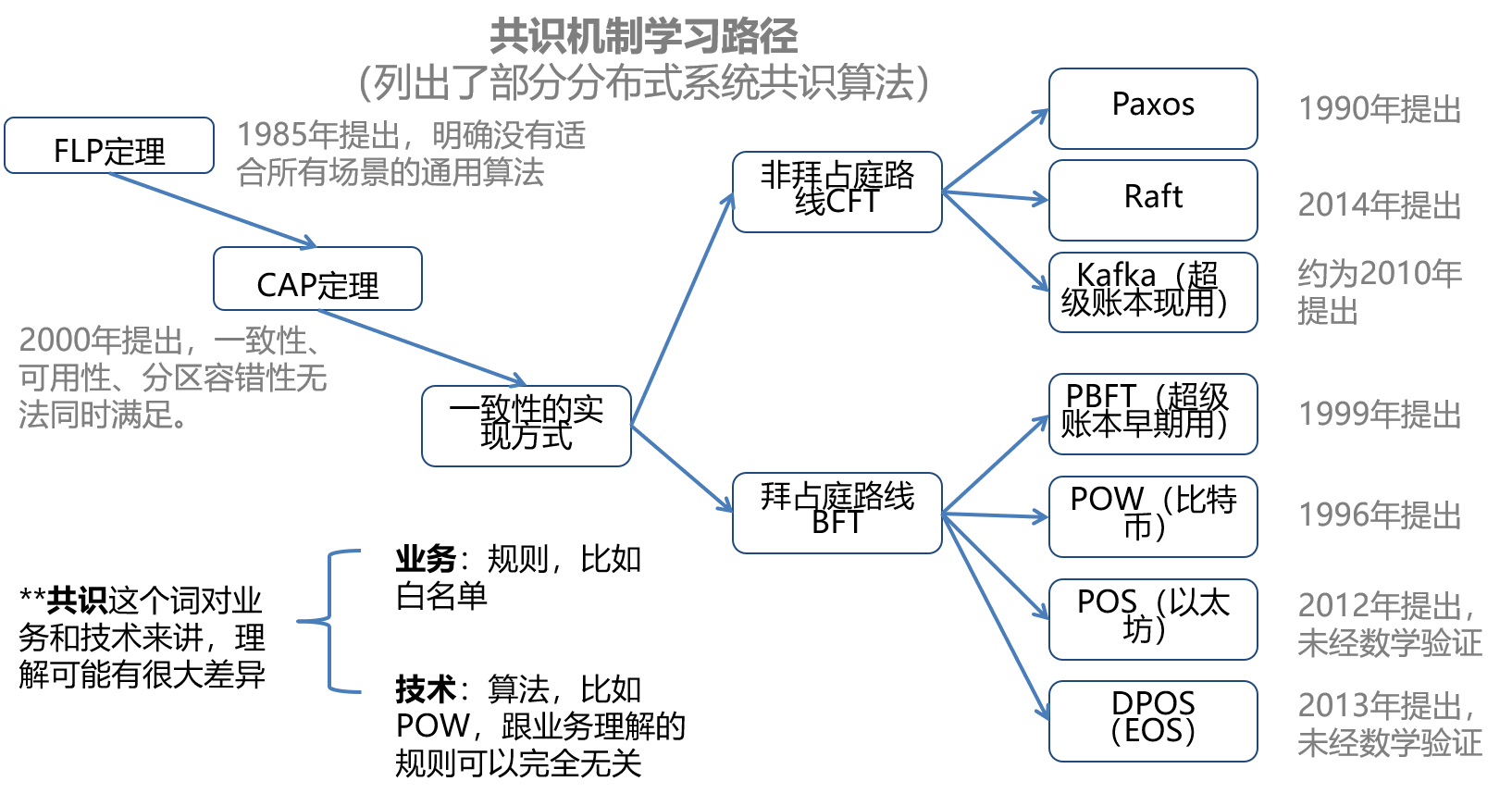 共識(shí)是區(qū)塊鏈中炒的很熱的概念,甚至?xí)尫羌夹g(shù)出身的同學(xué)覺得“共識(shí)”是區(qū)塊鏈發(fā)明的。我對共識(shí)了解不多,只是根據(jù)資料總結(jié)了一個(gè)共識(shí)的發(fā)展路徑或者說學(xué)習(xí)路徑供大家參考: