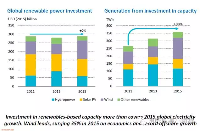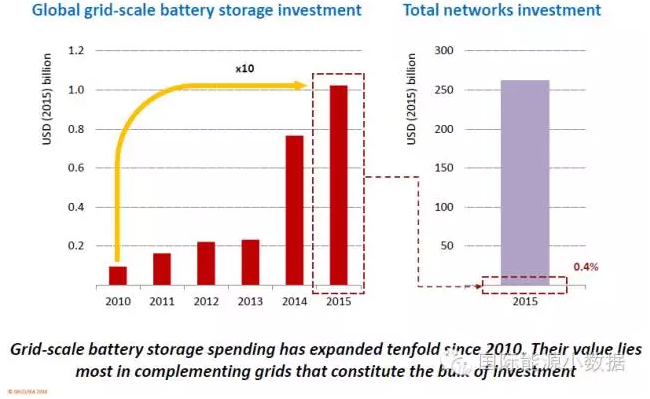 特別值得一提的是,2011年以來(lái)全球在可再生能源發(fā)電投資基本平穩(wěn),但是由于可再生能源成本的下降,每年新增的可再生能源發(fā)電量逐年增加,2015年超出2011年33%。此外,電力儲(chǔ)能投資2015年超過(guò)100億美元,是2010年的10倍;但是儲(chǔ)能投資僅占電網(wǎng)投資的0.4%,還有很長(zhǎng)的路要走。