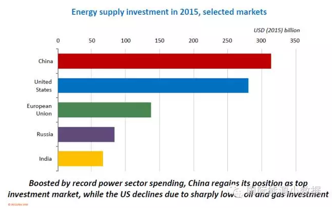 2015年中國(guó)能源領(lǐng)域總投資為3150億美元,占全球能源總投資的17%,是世界上第一能源投資大國(guó),遠(yuǎn)超位居第二的美國(guó)(2800億美元)。在中國(guó)能源投資中,有900億美元用于可再生能源發(fā)電;450億美元用于化石能源電廠(主要是煤電廠,2015年新增煤電裝機(jī)接近45吉瓦)。