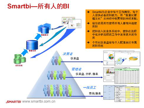 數據應用即為數據的應用、交換與服務,需要通過思邁特軟件Smartbi等可視化的途徑直接服務于企業(yè)的一線生產人員、監(jiān)管人員、業(yè)務負責人、公司高層以及企業(yè)董事。