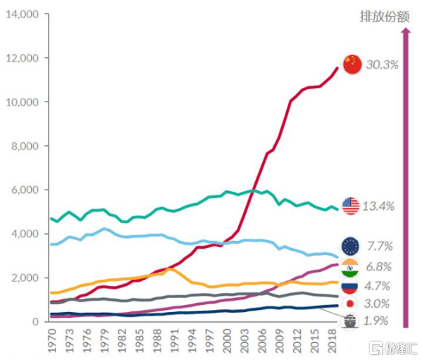 尤其是,中國、美國、歐盟等碳排放大國近幾年加快推進(jìn)“碳中和”實(shí)現(xiàn)進(jìn)程。根據(jù)公開數(shù)據(jù)顯示,2021年中國碳排放量占全球碳排放總量30.3%,美國占13.4%,歐盟占7.7%。