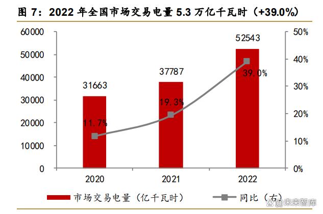 全國(guó)市場(chǎng)化交易電量占全社會(huì)用電量的比重逐年上升。新一輪電改實(shí)施以來(lái),我國(guó)電力 市場(chǎng)建設(shè)穩(wěn)步有序推進(jìn),價(jià)格機(jī)制也愈加完善,市場(chǎng)化交易電量占全社會(huì)用電量的比重大幅 提升。2022 年全國(guó)市場(chǎng)交易電量約 5.3 萬(wàn)億千瓦時(shí),同比高增 39.0%,占全社會(huì)用電量比 重為 60.8%,較 2021 年提升 15.3pp。據(jù)中電聯(lián)《中國(guó)電力行業(yè)年度發(fā)展報(bào)告 2022》顯示, 截至 2021 年底,全國(guó)各電力交易中心累計(jì)注冊(cè)市場(chǎng)主體 46.7 萬(wàn)家,數(shù)量較 2020 年增長(zhǎng) 76.0%。電力市場(chǎng)化建設(shè)具備先進(jìn)性,一方面,市場(chǎng)化價(jià)格有利于充分反映電力市場(chǎng)真實(shí)供 需變化,煤價(jià)上漲等成本壓力通過(guò)更高電價(jià)傳導(dǎo)到下游的機(jī)制更順暢;另一方面,電力市場(chǎng) 化交易有利于實(shí)現(xiàn)電力資源在全國(guó)范圍內(nèi)的優(yōu)化配置,更好實(shí)現(xiàn)跨省跨區(qū)電力傳送。