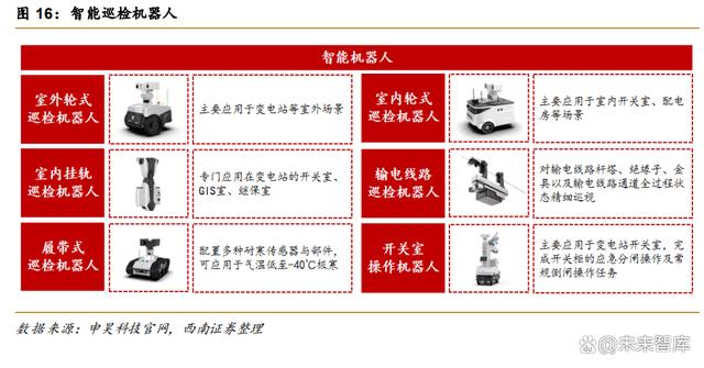 巡檢是保障電網(wǎng)穩(wěn)定性的重要環(huán)節(jié)。巡檢機(jī)器人有多種應(yīng)用場景,可在變電站、輸電網(wǎng) 等場景使用,其中在變電站的應(yīng)用更早,變電站巡檢場景包括室外場景及高壓室、保護(hù)室、 開關(guān)室等室內(nèi)場景。巡檢機(jī)器人可實(shí)現(xiàn)對室內(nèi)外設(shè)備的精準(zhǔn)檢測,并通過后臺對巡檢數(shù)據(jù)進(jìn) 行比對和分析,實(shí)現(xiàn)預(yù)測性維護(hù),在提高巡檢效率的同時,可有效保障設(shè)備的平穩(wěn)運(yùn)行。此 外,由于輸電通常在溝壑、高山、丘陵等環(huán)境復(fù)雜的區(qū)域,且輸電線路直接暴露于大氣環(huán)境 中,在運(yùn)行中會誘發(fā)多種事故,人工巡檢和檢修面臨著線路長、工作強(qiáng)度大、條件艱苦、效率低下、檢測質(zhì)量不佳等一系列問題,無法獲得輸電線路的實(shí)時運(yùn)行情況,甚至威脅作業(yè)人 員的生命安全,通過輸電線路巡檢機(jī)器人可實(shí)現(xiàn)對輸電線路桿塔、絕緣子以及輸電線路通道 等精確巡視,自動采集數(shù)據(jù)并進(jìn)行后臺分析,為輸電線路的運(yùn)維提供可靠的信息。