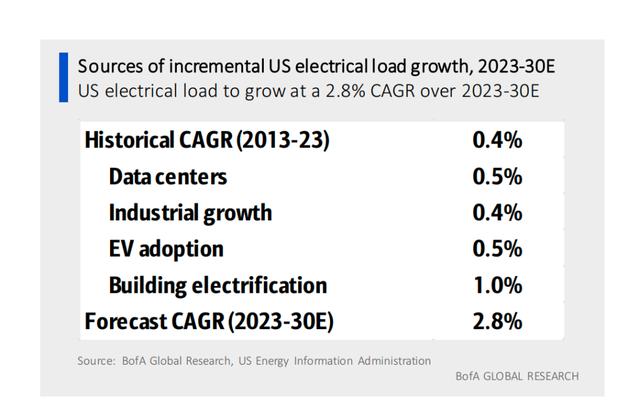 美銀美林在最新發(fā)布的研報中表示,隨著AI技術(shù)的飛速發(fā)展,美國電網(wǎng)的電力需求將面臨著前所未有的增長,預(yù)計2023年至2030年,美國電力需求將以2.8%的年復(fù)合增長率(CAGR)增長。
