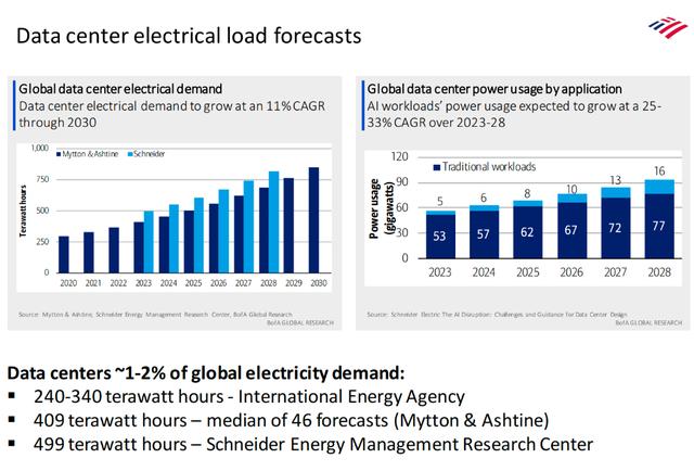 美銀美林預(yù)計,到2030年,數(shù)據(jù)中心的電力需求預(yù)計將以11%的復(fù)合年增長率增長。這相當于全球電力需求的約1-2%,即240-340太瓦時(1太瓦時等于10億千瓦時)。