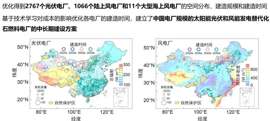 “我們根據(jù)多年太陽輻射和風(fēng)速的小時(shí)空間數(shù)據(jù),綜合考慮國(guó)家行政區(qū)劃、土地類型、氣候條件、等空間地理信息,同時(shí)基于五種不同的電廠形態(tài)分布和電廠各組件成本,優(yōu)化出2767個(gè)光伏電廠、1066個(gè)陸上風(fēng)電廠和11個(gè)大型海上風(fēng)電廠的空間分布和建造規(guī)模,并基于技術(shù)學(xué)習(xí)對(duì)成本的影響優(yōu)化各電廠的建造時(shí)間。”