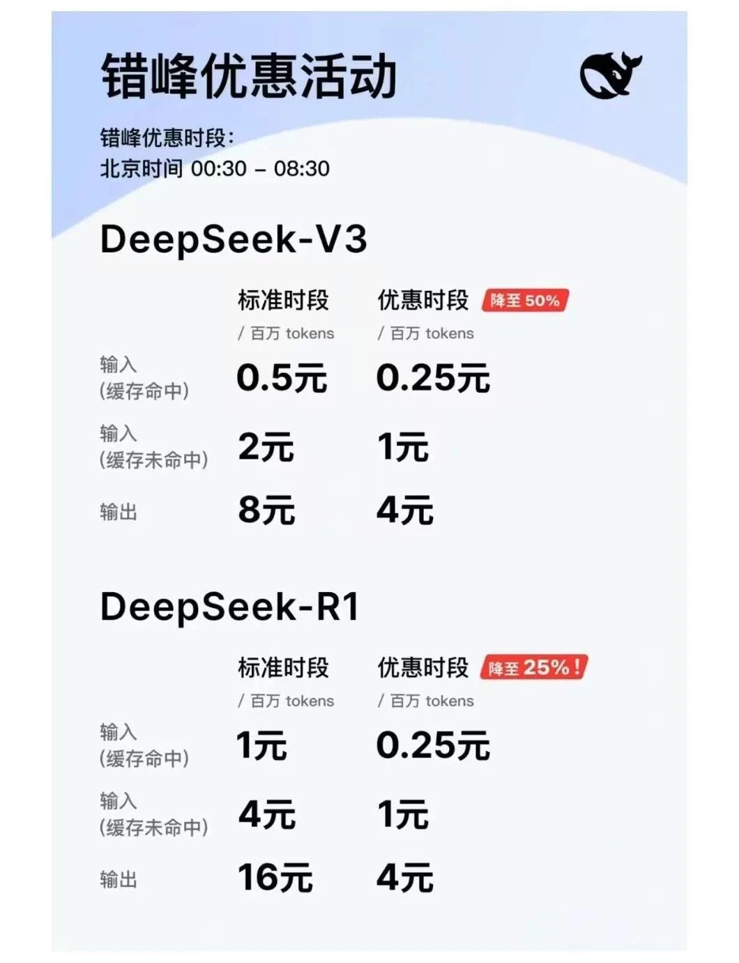 據(jù)了解,DeepSeek主要有兩款主力模型DeepSeek-chat(基礎(chǔ)大模型,對(duì)應(yīng)V3)和DeepSeek-reasoner(推理模型,對(duì)應(yīng)R1)。在標(biāo)準(zhǔn)時(shí)段(北京時(shí)間08:30—00:30),V3和R1的百萬tokens輸入(緩存命中)價(jià)格分別為0.5元和1元,百萬tokens輸出分別為8元和16元。而在優(yōu)惠時(shí)段(北京時(shí)間00:30—08:30),V3和R1的百萬tokens輸入(緩存命中)則均降為0.25元,百萬tokens輸出均降為4元。