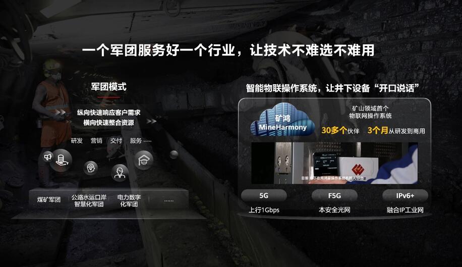 為了幫助企業(yè)選好技術(shù)、用好技術(shù),另一個關(guān)鍵措施就是成立軍團(tuán)。自去年底,我們已面向煤礦、港口、電力等多個行業(yè)成立了多個軍團(tuán)組織。軍團(tuán)是專業(yè)化隊伍,一方面,對內(nèi)拉通端到端的資源,包括研發(fā)、銷售、交付、服務(wù)等,以便深入理解行業(yè)的生產(chǎn)實踐和行業(yè)知識,打造適配場景的產(chǎn)品和解決方案;另一方面,對外聯(lián)合更多的解決方案伙伴,把華為和伙伴的能力整合在一起,形成針對性的解決方案。