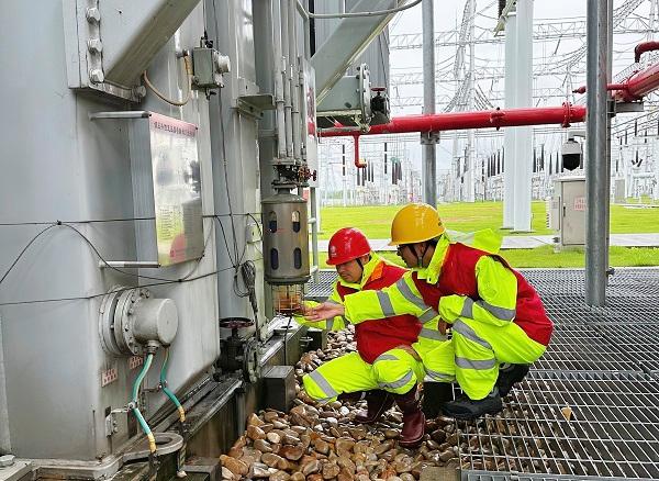圖說:國網(wǎng)上海超高壓公司1000千伏練塘站運維人員檢查特高壓主變運行情況