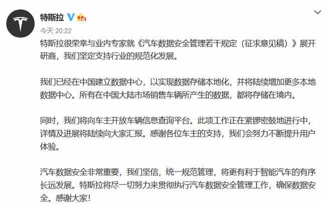5月25日,特斯拉宣布已經(jīng)在中國(guó)建立了數(shù)據(jù)中心,將實(shí)現(xiàn)數(shù)據(jù)存儲(chǔ)本地化,并將陸續(xù)增加更多本地?cái)?shù)據(jù)中心。所有在國(guó)內(nèi)市場(chǎng)銷售的車輛所產(chǎn)生的數(shù)據(jù)都將存儲(chǔ)在境內(nèi)。