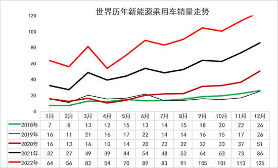 2022年世界新能源車起步較強(qiáng),1-3月基本實現(xiàn)強(qiáng)勢高增長,4-5月的新能源走勢放緩并劇烈下滑,6-12月世界新能源銷量持續(xù)較強(qiáng)增長。