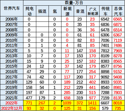 2012年世界廣義新能源汽車158萬臺,到2015年僅有179萬臺,增長緩慢。隨著2016年開始的新能源車加速發(fā)展,廣義新能源車2016年突破200萬臺;2017年達(dá)到317萬臺;2018年突破400萬臺;2020年達(dá)到515萬臺;2021年全年廣義新能源車977萬臺,其中普通混合動力達(dá)到319萬臺;2022年1-12月的廣義新能源汽車銷量1411萬臺,其中混合動力達(dá)到372萬臺,占比26%。