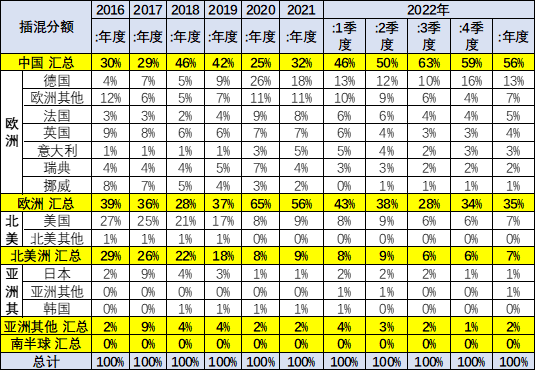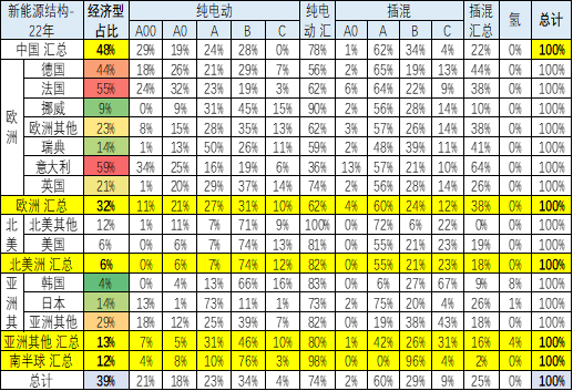 2022年的世界新能源車結(jié)構(gòu)是中國偏純電動。歐洲主力國家市場插混較強(qiáng),歐洲市場結(jié)構(gòu)的純電與插混持平的特征明顯,挪威等非汽車生產(chǎn)國家的純電動較強(qiáng)。