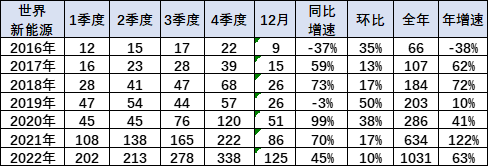 2019年新能源減速趨勢超預(yù)期。前期連續(xù)幾年世界新能源銷量已經(jīng)超越60%增速。2021年表現(xiàn)較強(qiáng),全年增速回升到122%。2022年銷量增長63%仍很強(qiáng)。