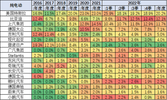 從歷年銷量份額看,特斯拉保持世界第一,目前持續(xù)走強(qiáng)。中國的比亞迪(294.540, -8.08, -2.67%)和上汽集團(tuán)(14.820, -0.14, -0.94%)的新能源表現(xiàn)優(yōu)秀,上汽乘用車和上汽五菱兩家自主車企表現(xiàn)很好。德國大眾的新能源車表現(xiàn)較強(qiáng),2021年受到疫情嚴(yán)重影響,加之去年年末沖刺,年初走勢偏弱。寶馬集團(tuán)、德國奔馳等保持在第二梯隊水平。