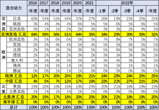 中國近兩年混動高速發(fā)展,2022年成為世界較大的混動市場,超越美國成為超強(qiáng)主力。