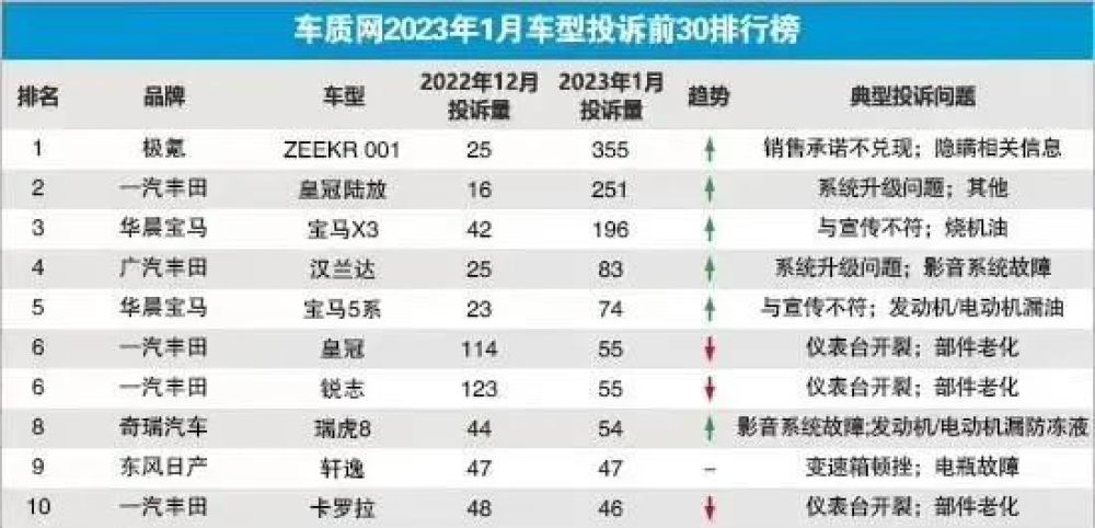 但另一方面,根據(jù)車質(zhì)網(wǎng)公布的2023年1月車型投訴排行榜,極氪001在1月份以355單的投訴量“榮登榜首”,登榜原因主要集中在銷售欺詐、承諾不兌現(xiàn)以及新車座椅鼓包等問題,極氪如果想要在汽車市場上走得更遠(yuǎn),這個(gè)售前售后的問題及時(shí)給消費(fèi)者解決。
